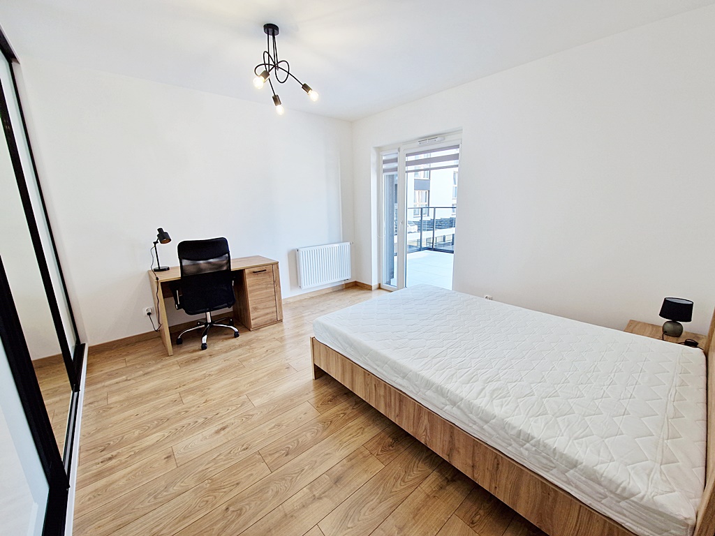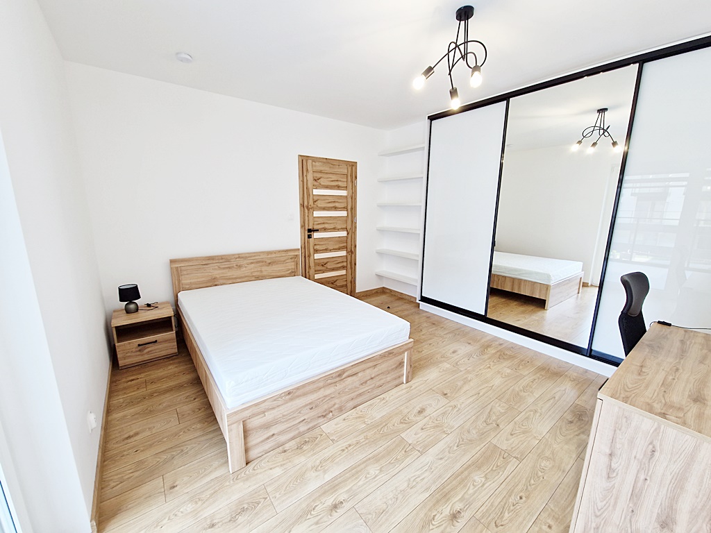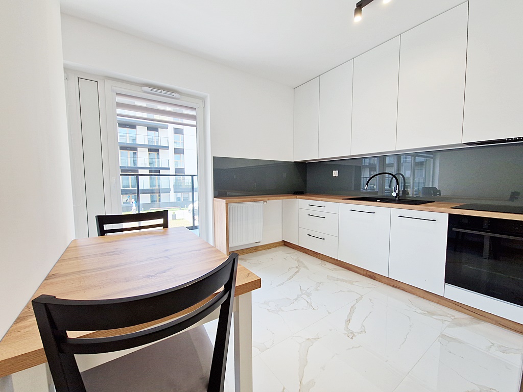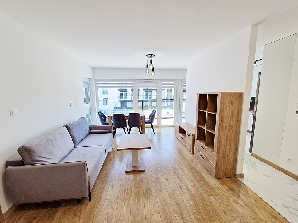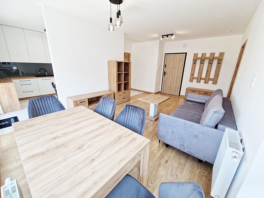 Mieszkanie środkowe, jednostronne - rozkładowe. Kuchnia otwarta na salon z wyjściem na balkon. Umeblowana i wyposażona w niezbędny sprzęt AGD (lodówkę, płytę indukcyjną, zmywarkę, okap, piekarnik). Atutem nieruchomości jest duży taras, o powierzchni 28 m2, połączony z salonem, oraz z sypialnią. Apartament w wysokim standardzie, wybudowany w 2023 roku. Do dyspozycji mieszkańców sauna, siłownia oraz pokój zbaw dla dzieci. Teren ogrodzony, wokół monitoring, zabezpieczony domofonem. Istnieje możliwość podłączenia TV, jak i internetu. Nieruchomość usytuowana pośród terenów zielonych, sklepów, szkoły, parku, punktów usługowych.