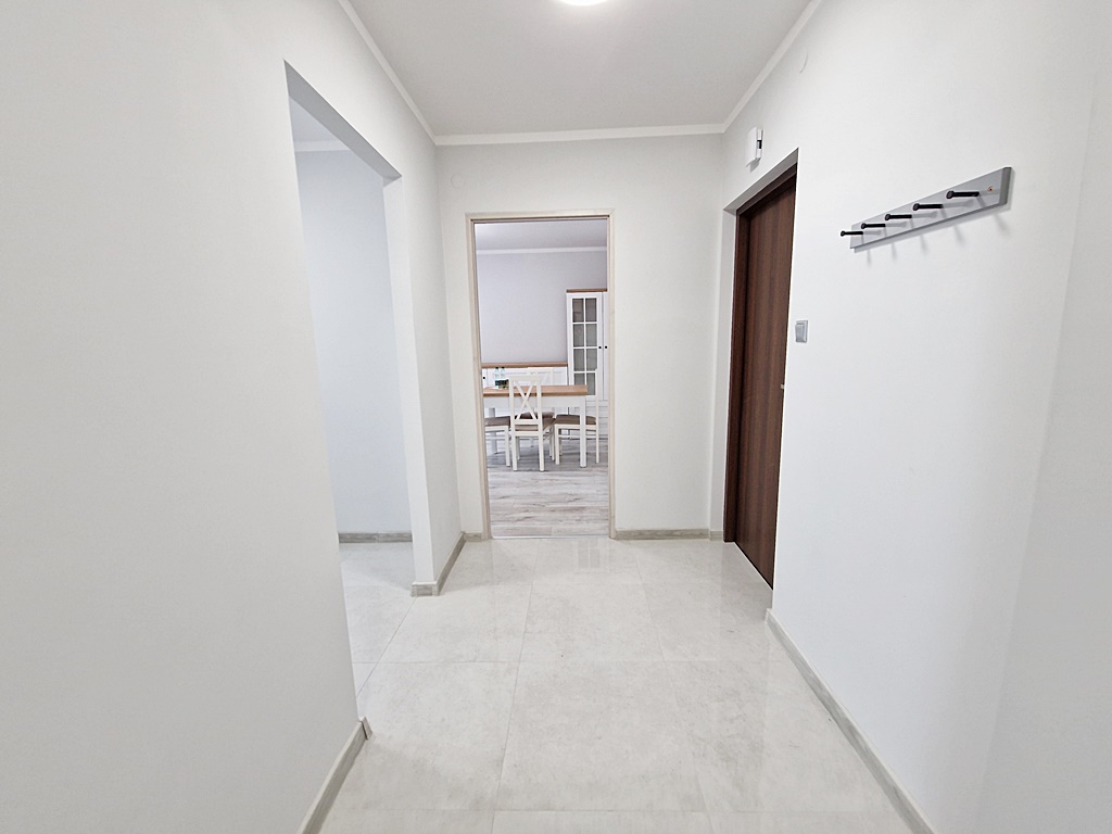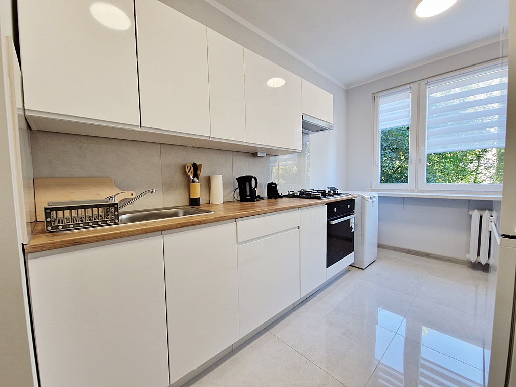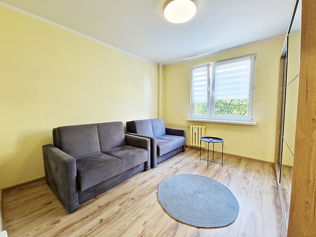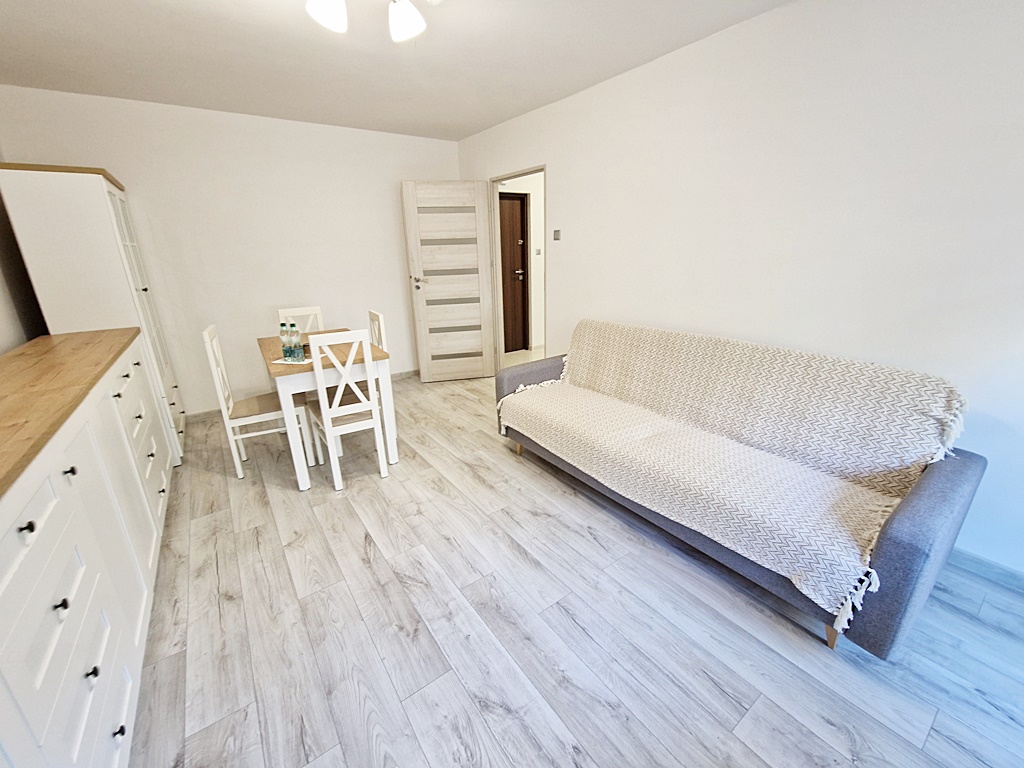 Mieszkanie umeblowane i wyposażone. W salonie znajduje się kanapa z funkcją spania, stół z krzesłami, meble. Pokój wyposażony został w dwa rozkładane fotele oraz dużą szafę z lustrem. Natomiast kuchnia umeblowana i wyposażona w lodówkę, kuchenkę gazową, piekarnik, okap, pralkę. W łazience znajduję się kabina prysznicowa, umywalka oraz WC.