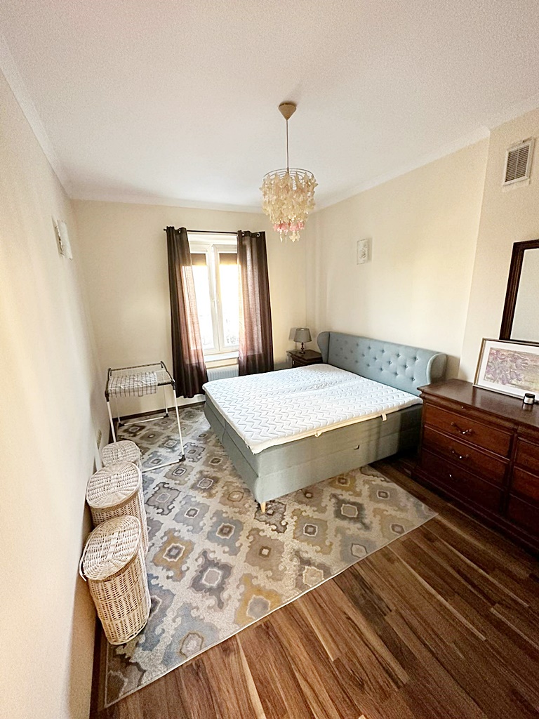Osobna, widna kuchnia umeblowana i wyposażona została w lodówkę, płytę grzewczą, piekarnik, okap, zmywarkę i pralkę. W salonie duża kanapa, fotel wypoczynkowy, meble,TV. Wyjściem na balkon. Dodatkowo została zamontowana klimatyzacja. W sypialni duże nowoczesne łóżko, komoda. W łazience kabina prysznicowa, umywalka oraz WC. Wszystko zostało starannie wykończone i umeblowane.